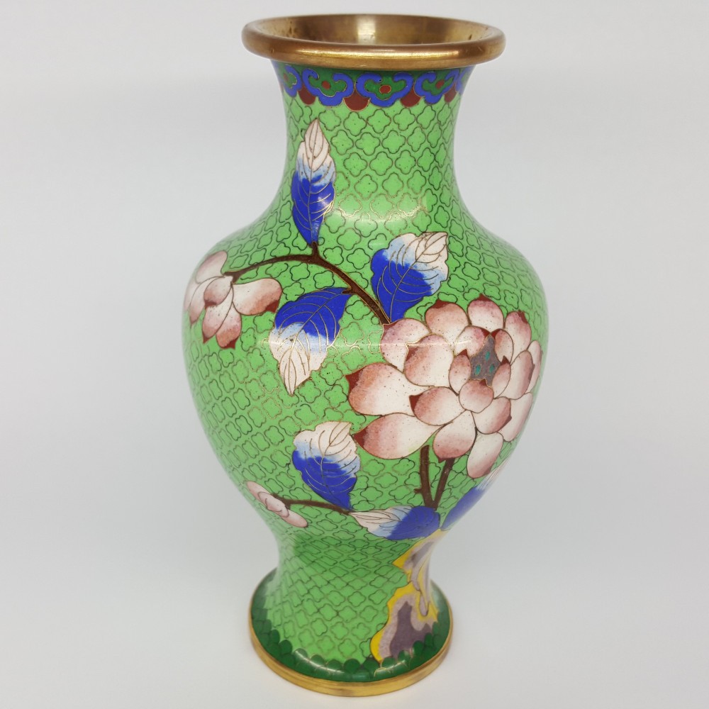 Vaza vintage bronz si email - CLOISONNE - 17 cm inaltime, 11 cm diametrul acolo unde are grosimea mai mare