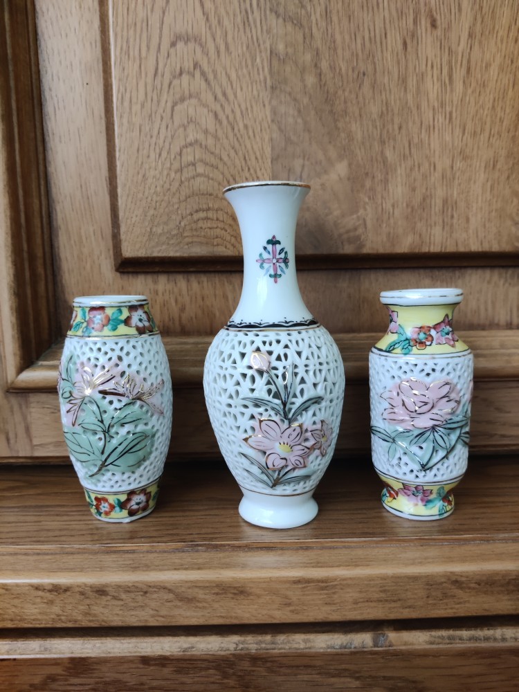 Cele trei vaze sunt in stare perfecta, artă manuală, se pot utiliza doar in scop decorativ, eventual pt plante uscate. Sunt postate sub prețul real deoarece nu poseda suporții. Prețul este pt toate împreună.