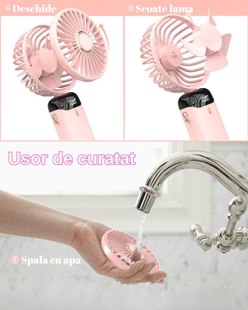 Cu posibilitatea de a-l plia și transporta ușor în geantă, acest mini-ventilator devine partenerul tău de încredere în fiecare călătorie și aventură. | Poti utiliza uleiuri esentiale. Această caracteristică ingenioasă îți oferă posibilitatea de a personaliza mediul înconjurător atât cu o briză răcoritoare, cât și cu aroma preferat. | Se curata usor, deschizand capacul ventilatorului rotind în sens invers acelor de ceasornic. Scoateți lama ventilatorului. Spălați cu apă. |