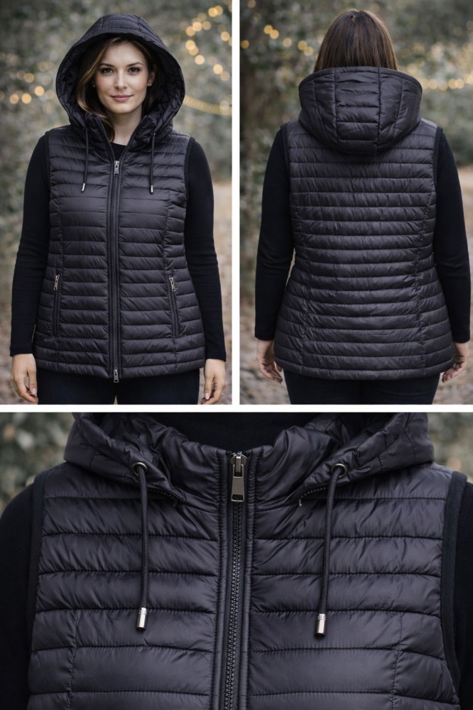 Vestă matlasată cu glugă Vestă de iarnă modernă, ideală pentru zilele răcoroase, realizată din material matlasat ușor și confortabil. Modelul are glugă integrată, închidere cu fermoar frontal și buzunare laterale cu fermoar, practice pentru obiectele personale.Detalii produs:Vestă matlasată, potrivită pentru sezonul receGlugă integrată pentru protecție suplimentarăÎnchidere cu fermoar pe toată lungimea2 buzunare laterale cu fermoarLook casual-sport, ușor de asortatRecomandare styling: poart-o peste un pulover sau hanorac, cu jeanși/leggings și ghete pentru un outfit de zi, comod și practic.