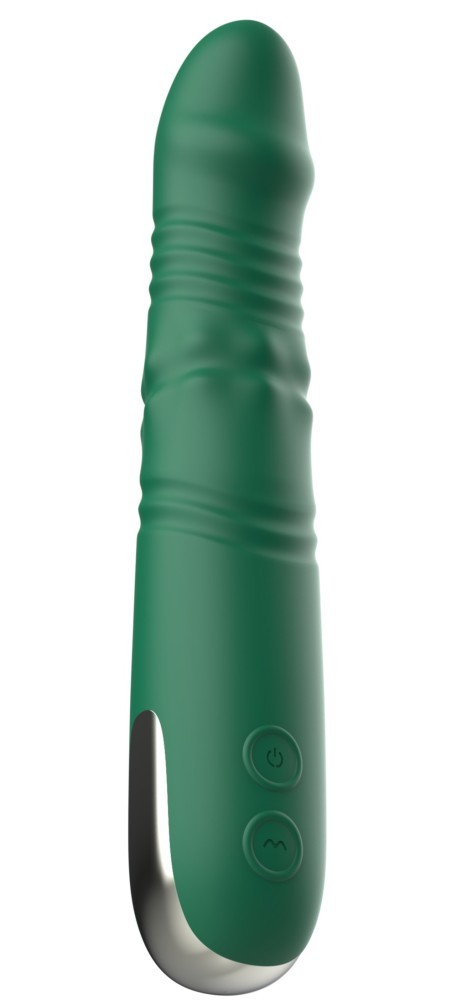 Vibrator cu design atractiv, realizat din material catifelat intr-o nuanta atragatoare de verde. Forma usor curbata si varful evidentiat sunt perfecte pentru stimularea vaginala a punctului G dar produsul poate fi folosit si pentru stimularea altor zone erogene. Jucaria dispune de striatii fine dispuse pe randuri multiple atat in partea superioara cat si in partea inferioara a suprafetei, ceea ce accentueaza senzatiile de placere si stimuleaza intens peretii vaginali. De asemenea, siliconul din care este confectionat vibratorul, se simte foarte fin si placut in contact cu pielea, oferind o folosire confortabila, fara a crea vreun fel de disconfort sau neplacere. Manerul are o insertie de argintiu si ofera o nota de eleganta intregului ansamblu, facand produsul potrivit si pentru un cadou catre o persoana cu care doriti o altfel de interactiune. Acesta ajuta totodata la o manevrare mai buna a produsului. Vibratorul este dotat cu 10 functii clasice de vibratie, care se actioneaza simplu prin apasarea butonului din partea inferioara a panoului de control. Pentru o experienta cat mai realistica in utilizarea lui, vibratorul este prevazut si cu functii de impingere sus-jos. Totodata, in interiorul materialului la jumatatea produsului, jucaria dispune de un ansamblu cu bilute care se rotesc si ajuta la o extra stimulare a peretilor vaginali. Functiile de impingere si rotire a bilelor functioneaza concomitent, iar vibratorul dispune de 10 astfel de functii de stimulare. Acestea se acceseaza si controleaza prin apasarea scurta a butonului de pornit/oprit. Se reincarca cu ajutorul cablului magnetic din dotare, este un produs ergonomic, usor de intretinut si de folosit. Pentru a evita deteriorarea produsului, se recomanda utilizarea impreuna cu lubrifianti pe baza de apa si igienizarea cu solutii speciale pentru curatarea jucariilor erotice. | Material: Silicon + ABS | Lungime: 22 cm | Diametru: 3.5 cm | Splashproof: Da | USB: Da | Culoare: Verde | Functii: Vibratii/Impingere