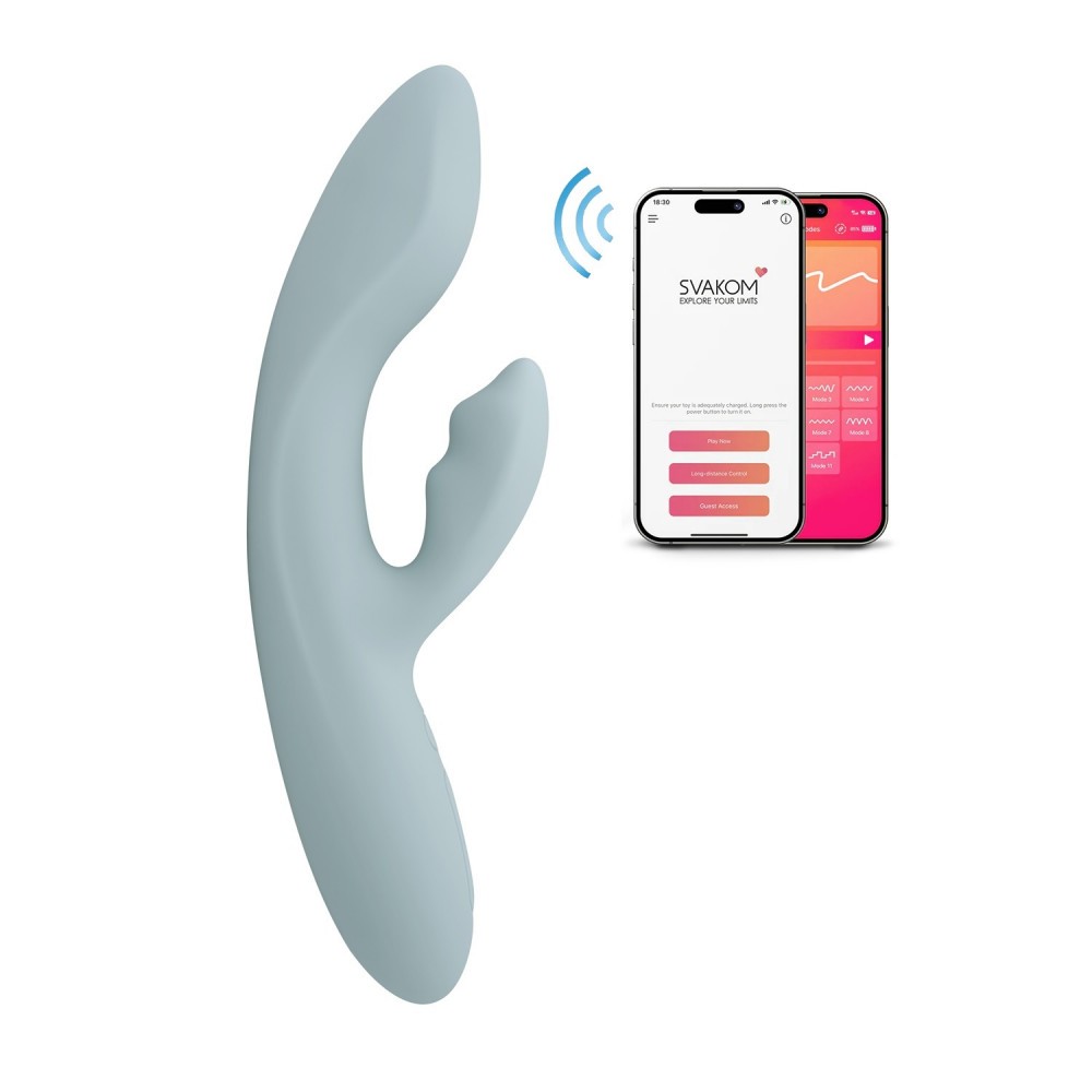 Vibrator de tip rabbit, realizat din silicon lichid. Extremitatea pentru stimularea punctului G dispune de forma arcuita si varf bombat. Stimulatorul clitoridian dispune de usoare denivelari si este extrem de flexibil, pentru a se potrivi perfect pe conturul corpului. In modul clasic, dispune de 5 moduri de vibrare cu 5 nivele de intensitate si functie de incalzire, temperatura maxima fiind de 38 de grade Celsius. Pentru a accesa mai multe setari, inclusiv personalizate, si control de la distanta, poti utiliza aplicatia Svakom. Aplicatia pentru utilizatorii de telefoane cu sistem de operare Android poate fi descarcata de aici. Aplicatia pentru utilizatorii de iPhone poate fi descarcata de aici. Atentie! Inainte de a achizitiona produsul, va rugam sa verificati compatibilitatea telefonului dumneavoastra pe site-ul care face trimitere la aplicatie. | Material: Silicon lichid | Lungime: 19 cm | Diametru: 3 cm | USB: Da | Functie incalzire: Da | Culoare: Gri