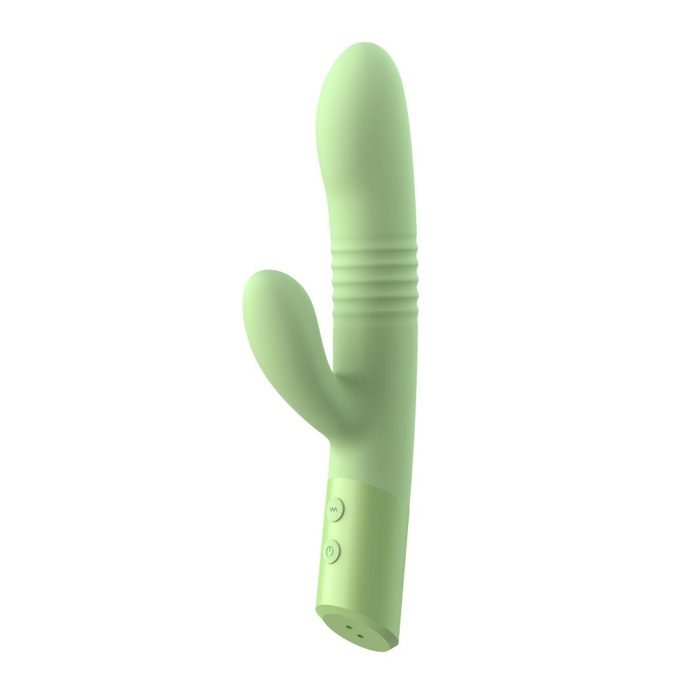 Vibrator din silicon lichid, cu design care permite stimularea in acelasi timp a punctului G si a clitorisului. Pentru o stimulare cat mai intensa, este dotat cu 2 motoare puternice, silentioase, cate unul in fiecare stimulator. Este prevazut cu 10 functii de vibrare, iar stimulatorul pentru punctul G dispune si de functie telescopica, marind cu 1.5cm lungimea inserabila. Vine la pachet cu o baza de incarcare magnetica. | Material: Silicon lichid + ABS | Lungime: 27 cm | Diametru: 3.5 cm | Splashproof: Da | USB: Da | Culoare: Verde | Functii: Vibratii/Impingere