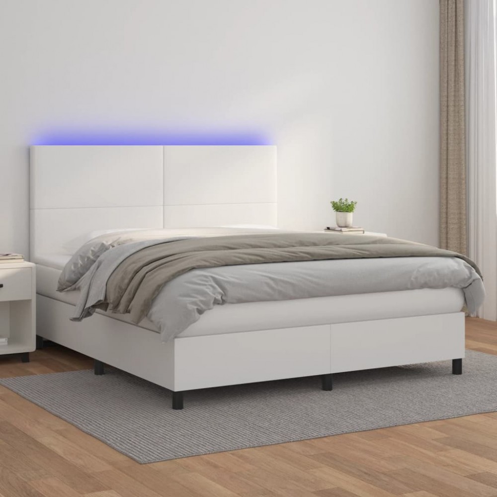 vidaXL Pat cu arcuri, saltea și LED, alb, 180x200 cm, piele ecologică 3135838