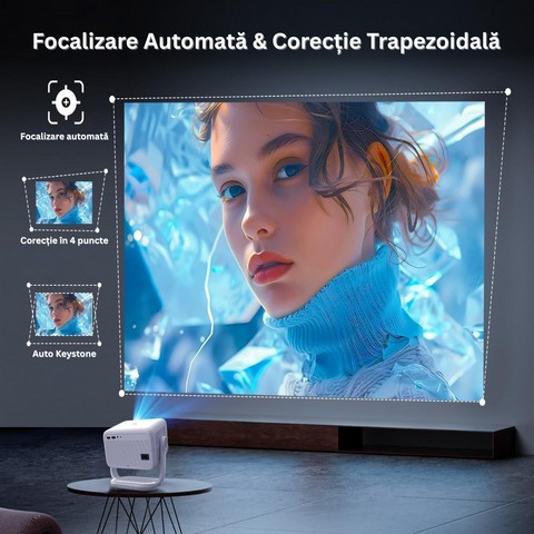 🔎 Focalizare automată + Corecție trapezoidală automată 4D – imagine perfect aliniată din orice unghi