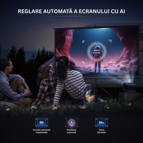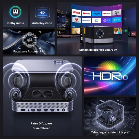 Transformă-ți livingul într-un adevărat cinema acasă cu acest videoproiector inteligent de ultimă generație, care combină imaginea 1080P nativă cu suport 4K, sunet Dolby 3D și funcții AI automate pentru o experiență premium de vizionare.