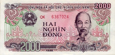 Splendida bancnota de 2000 Dong din Vietnam 1988 (P-107) în stare necirculatã (UNC).
