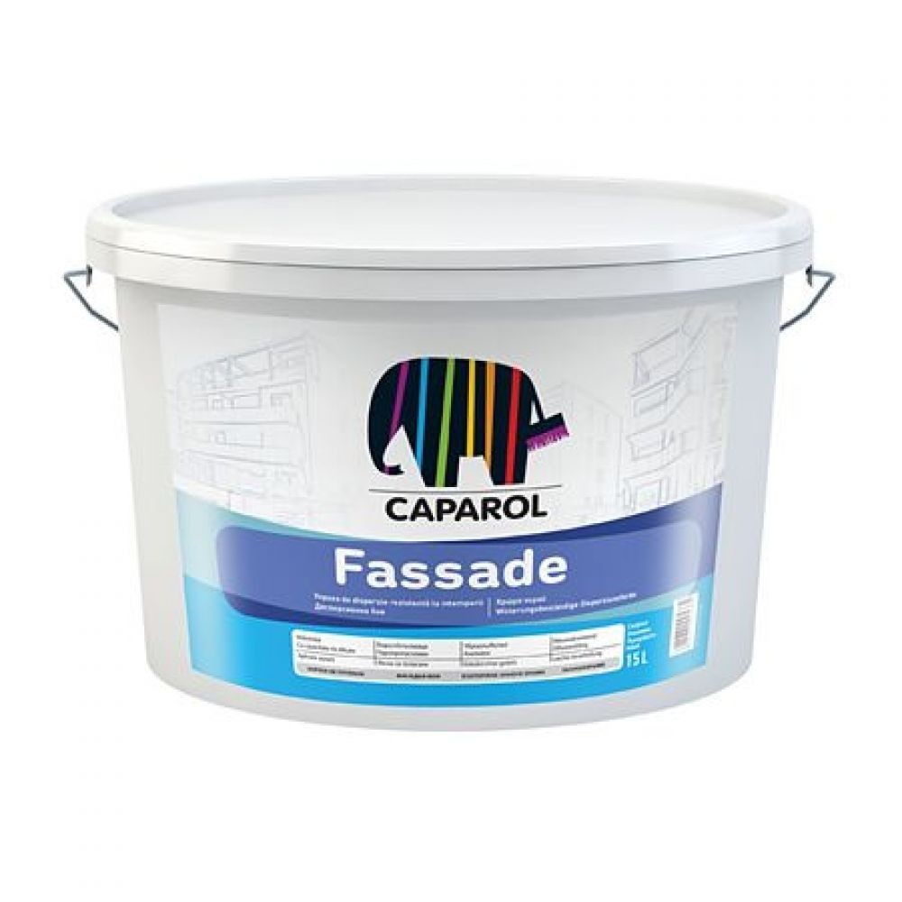 Vopsea de dispersie economică Fassade Caparol albă, mată, destinată suprafețelor expuse intemperiilor.
