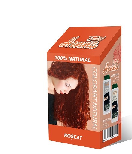 Henna Roscat Colorant 100 % natural. Henna este un produs vegetal natural, care provine din frunzele uscate ale copacului de Henna, care au fost apoi pulverizate. Frunzele de Henna au fost folosite inca din antichitate ca un colorant natural, care ofera parului, stralucire, suplete, rezistenta, fiind astfel un excelent regenerator al parului. Planta are proprietati antibacteriene si antifungice fiind foarte utila si pentru tratarea eczemelor. Pachet cu 100 grame. Se amesteca pulberea de Henna cu putina apa fierbinte. Pentru a mari efectul nutritiv asupra radacinii firului de par se poate adauga si un galbenus de os si o lingura de ulei de masline. Apoi se amesteca bine pana cand rezulta o pasta uniforma. Se aplica pasta in mod uniform, de la radacina pana la varful firelor de par. Se acopera capul si se lasa astfel timp de aproximativ 2 ore. Apoi se clateste parul cu apa calduta, fara sampon. Metoda de vopsire cu ajutorul frunzelor de Henna este avantajoasa deoarece ea nu este doar o simpla vopsire a parului, ci reprezinta totodata si un tratament de tonifiere a parului, tratament care este cunoscut si folosit de mii de ani. "Colorantii pentru par pot cauza reactii alergice severe. Acest produs nu este destinat pentru uzul persoanelor cu varsa sub 16 ani. Tatauajele temporare cu: henna neagra va poate creste riscul de alergie. Nu va colorati parul daca: aveti o eruptie pe fata sau scalp sensibil, iritat sau cu leziuni, ati avut vreodata orice reactie dupa colorarea parului, ati avut in trecut o reactie la un tatuaj temporar cu ""henna neagra"". A nu se utiliza la vopsirea genelor sau a sprancenelor." Intensitatea culorii poate fi influentata de nuanta initiala a parului.