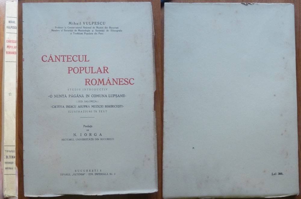 M. Vulpescu, Profesor la Conservator, Cantecul popular romanesc, O nunta pagana in com. Lupsani, Cateva indicii asupra muzicei bisericesti, 1930. Format apropiat de A4, 292 pagini, ilustratii in text, stare foarte buna.