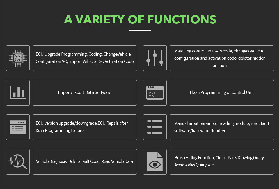 Features mainly include: diagnosis, programming (incl. programming one module only), coding, realize hidden function, new features activation, the module system update.