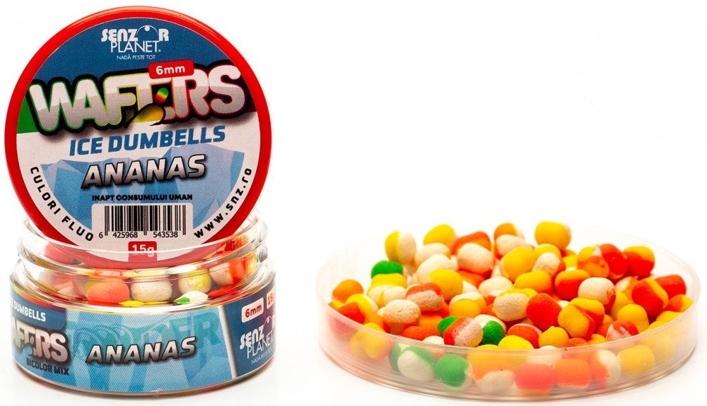 <h4>Wafters Ice Dumbells Senzor Bicolor, Ananas, 6mm, 15g</h4><p><br></p><p>Momeli de mare atractie, in doua culori, cu forma cilindrica, ideale pentru perioadele in care pestii se hranesc apatic. Sunt realizate din mix de pop-up si sunt foarte usor flotante (wafters). Datorita diametrului redus si a mixului de culori, aceste momeli sunt recomandate în special la începutul sau la finalul sezonului, când temperatura apei scade. In interiorul borcanului se gaseste o varietate de momeli in doua culori, disponibile in combinatii precum: alb-rosu, galben-rosu, alb-galben, alb-verde, alb-portocaliu, etc. Se echilibreaza perfect cu carlige mici, nr 8, 10, 12 si 14. Recomandam folosirea lor la forfacele cu fir de par, cu spin sau banda elastica. In anumite conditii de transport sau de depozitare, diametrul waftersului poate varia, in timp, cu 1-2 mm.</p><p><br></p><p></p><ul><li>Tip produs: Wafters Ice Dumbells Bicolor</li><li>Producator: Senzor</li><li>Diametru: 6mm</li><li>Utilizare pentru apa rece</li><li>Aroma: Ananas</li><li>Culoare: Bicolor</li><li>Mod de ambalare: 15g</li></ul><p></p>