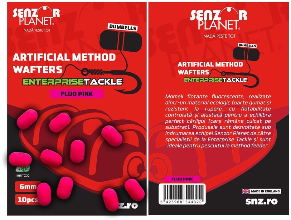 <h4>Wafters Senzor Method Enterprise Tackle Dumbells, Fluo Pink, 6mm, 10buc/pac</h4><p><br>Momeli flotante fluorescente, realizate dintr-un material ecologic foarte gumat si rezistent la rupere, cu flotabilitate controlata si ajustata pentru a echilibra perfect carligul (care ramane culcat pe substrat). Produsele sunt dezvoltate sub indrumarea echipei Senzor Planet de catre specialistii de la Enterprise Tackle si sunt ideale pentru pescuitul la method feeder.</p><p><br></p><ul><li>Tip produs: Wafters</li><li>Producator: Senzor</li><li>Model: Enterprise Tackle Fluo</li><li>Forma: Cilindrica</li><li>Diamentru: 6mm</li><li>Material: silicon</li><li>Aroma: natural</li><li>Culoare: roz fluo</li><li>Mod de ambalare: 10buc/pac</li></ul><p></p><p></p>