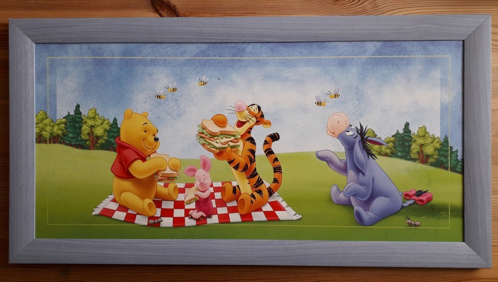 Tablou de bună calitate, imprimat pe pfl, cu ramă, de mari dimensiuni (de 76,7 x 40 cm), cu personajul Disney the Pooh şi prietenii săi. Ideal pentru decorat cameră de copii. Cadou un tablou imprimat pe muşama cu Winnie!!