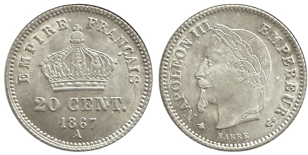 y537 FRANTA MONEDA 20 CENT 1867A ARGINT NECIRCULATA UNC CU LUCIU
