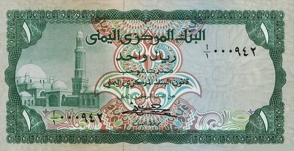 Splendida bancnota de 1 Rials din Yemen 1973 (P-11b) în stare necirculatã (UNC).
