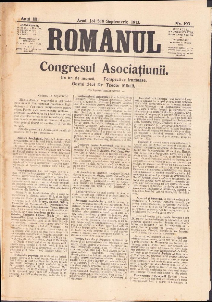 Ziarul „Românul” din Arad, 5/18 septembrie 1913, vorbind pe larg