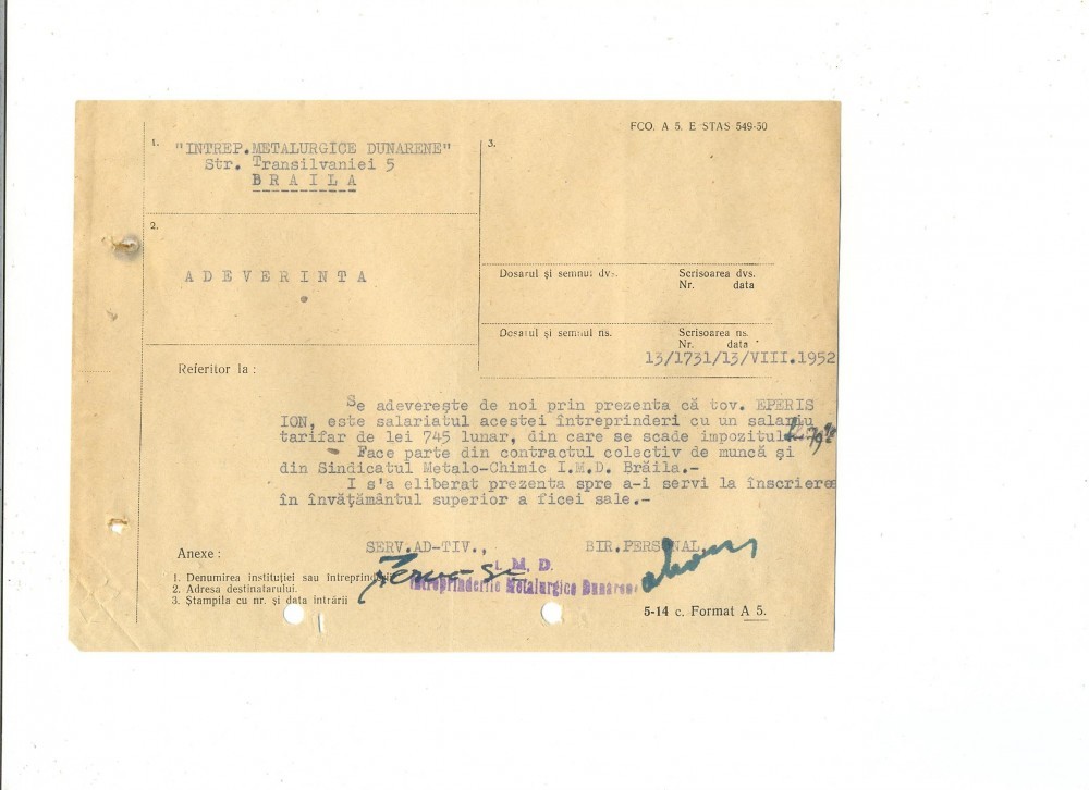 Z230 DOCUMENT VECHI - ,,INTREPR.METALURG.DUNARENE"BRAILA- A SERVI LA SCOALA 1952