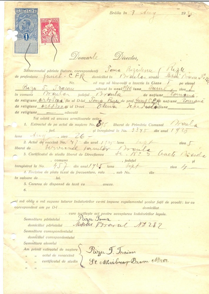 Z263 DOCUMENT VECHI -SCOALA COMERCIALA , BRAILA - TOMA RIZULESCU -RIZU -AN 1925