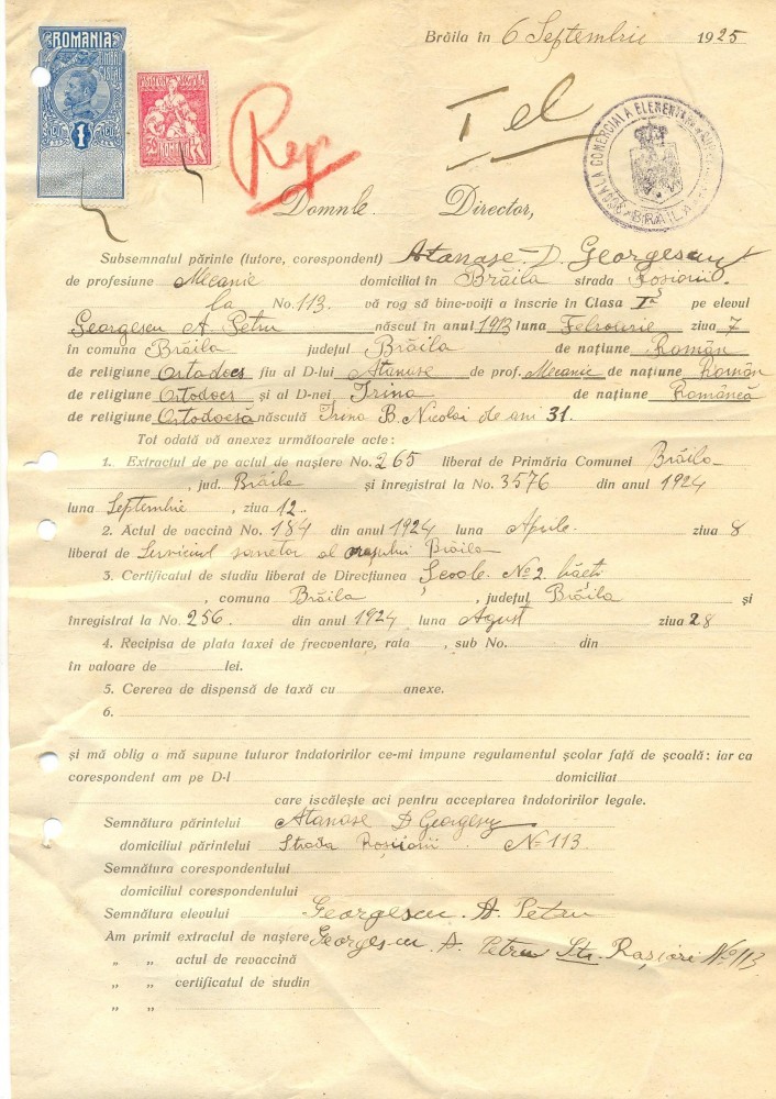 Z275 DOCUMENT VECHI -SCOALA COMERCIALA , BRAILA - ATANASE D. GEORGESCU -AN 1925