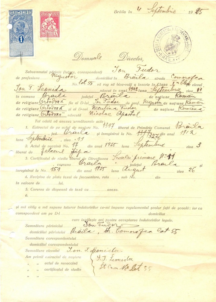 Z329 DOCUMENT VECHI -SCOALA COMERCIALA , BRAILA - ION TUDOR -AN 1925