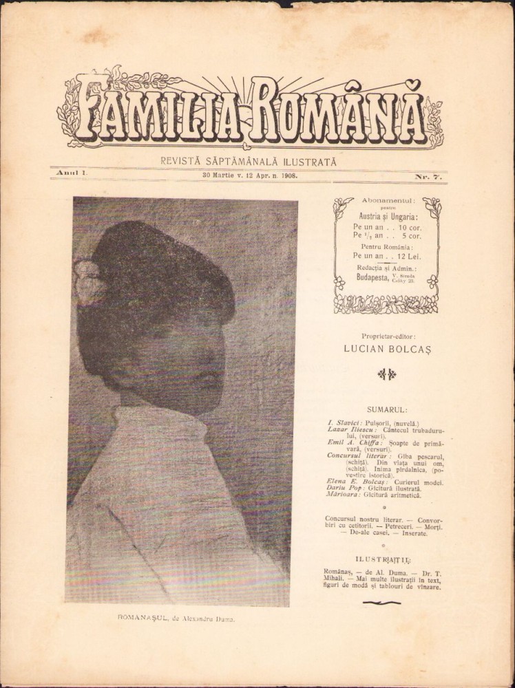 Z59 Familia română, numărul 7, anul 1, 1908, Budapesta, proprietar-editor Lucian Bolcaș