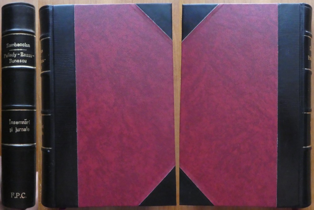 Fl. 216, 132, 126 si respectiv 140 pagini. Ultima lucrare cu autograful lui Marius Bunescu. Cotor si colturi piele, stare foarte buna a legaturii, cu mentinerea copertelor originale ale celor 4 lucrari aflate in coligat. Jurnalul lui Pallady are pe pagina de titlu un ex libris aplicat prin lipire.