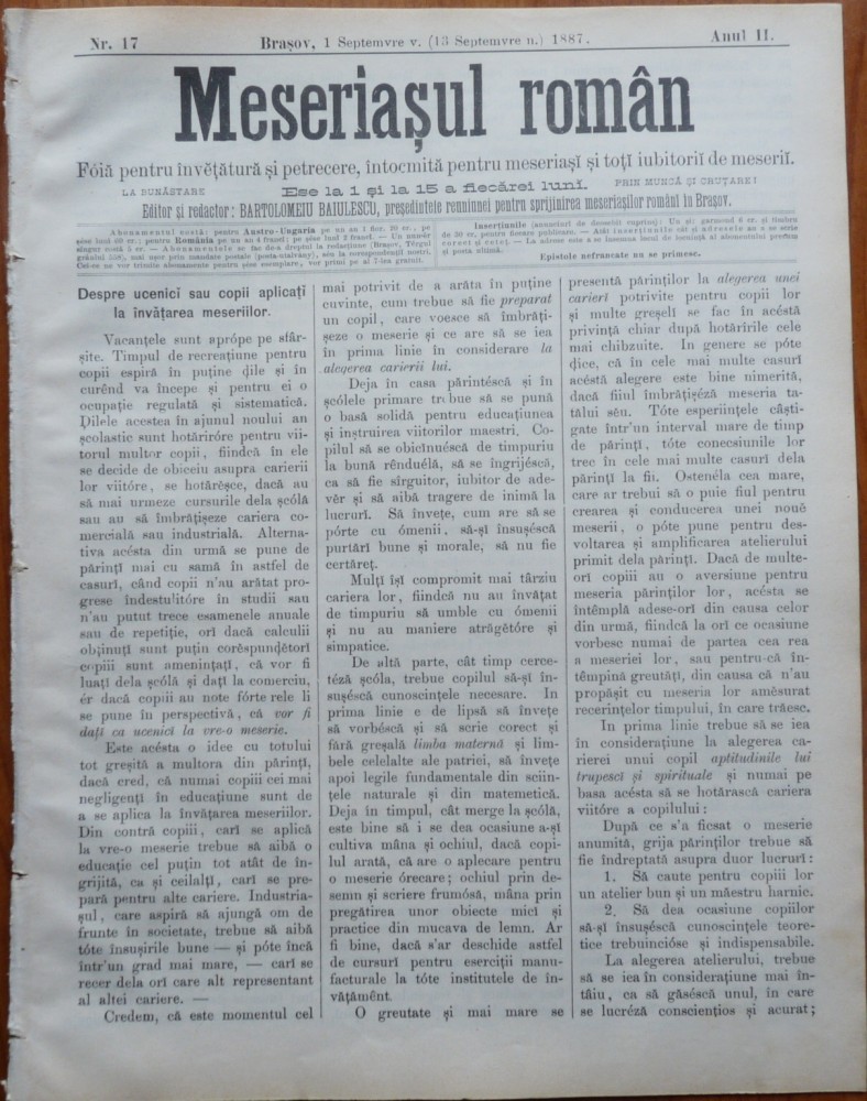Ziarul Meseriasul Roman , nr. 17 , 1887 , Brasov