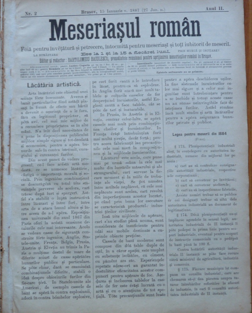 Ziarul Meseriasul Roman , nr. 2 , 1887 , Brasov