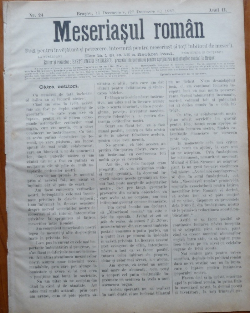 Ziarul Meseriasul Roman , nr. 24 , 1887 , Brasov