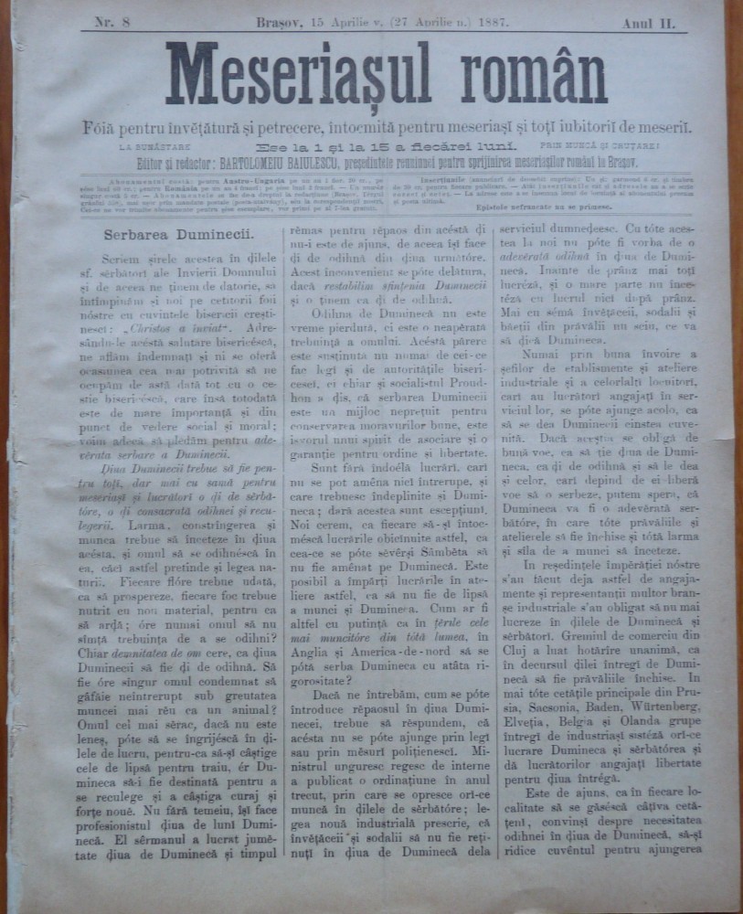 Ziarul Meseriasul Roman , nr. 8 , 1887 , Brasov