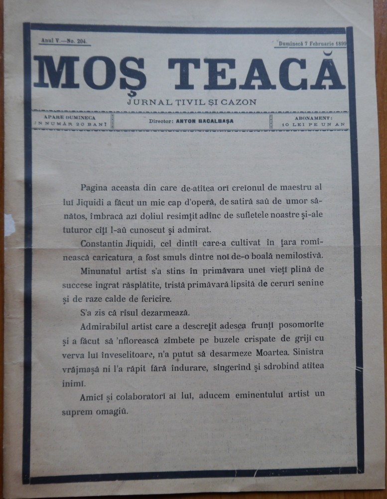 Ziarul Mos Teaca , jurnal tivil si cazon , nr. 204 , an 5 , 1899 , Bacalbasa