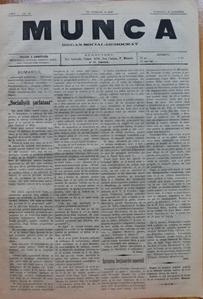 Ziarul Munca , organ social-democrat ,an 1 ,nr. 40 ,1890 , I. Nadejde , C. Mille