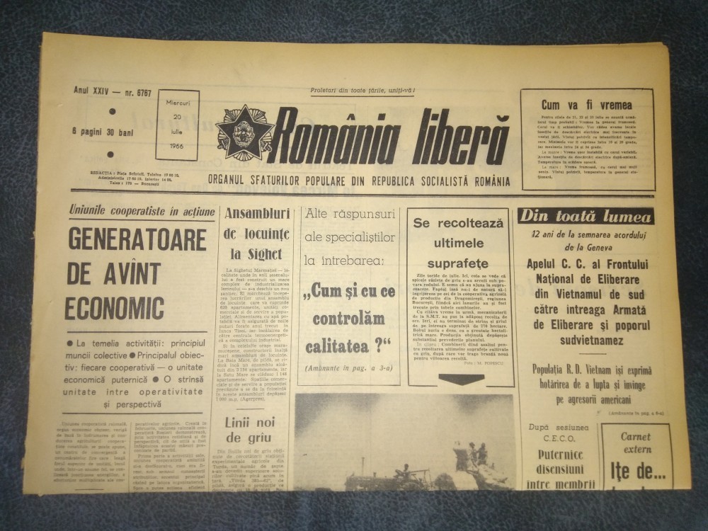 ZIARUL ROMANIA LIBERA 20 IULIE 1966 RAZBOI VIETNAM