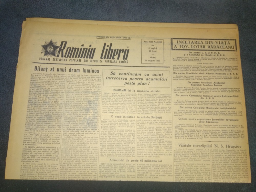ZIARUL ROMANIA LIBERA 26 AUGUST 1955 LOTAR RADACEANU A INCETAT DIN VIATA