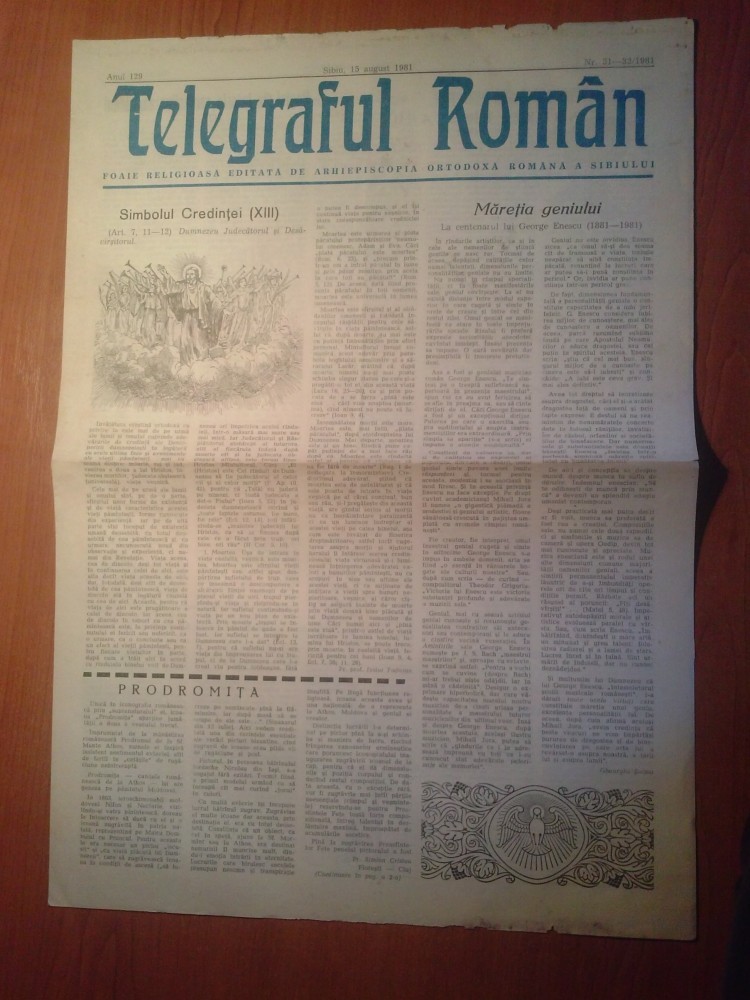 ziarul telegraful roman 15 august 1981 -foaie editata de arhiepiscopia sibiului