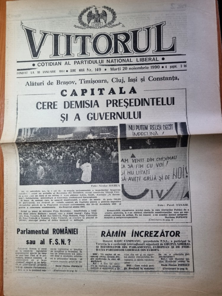ziarul viitorul 20 noiembrie 1990-capitala cere demisia presedintelui