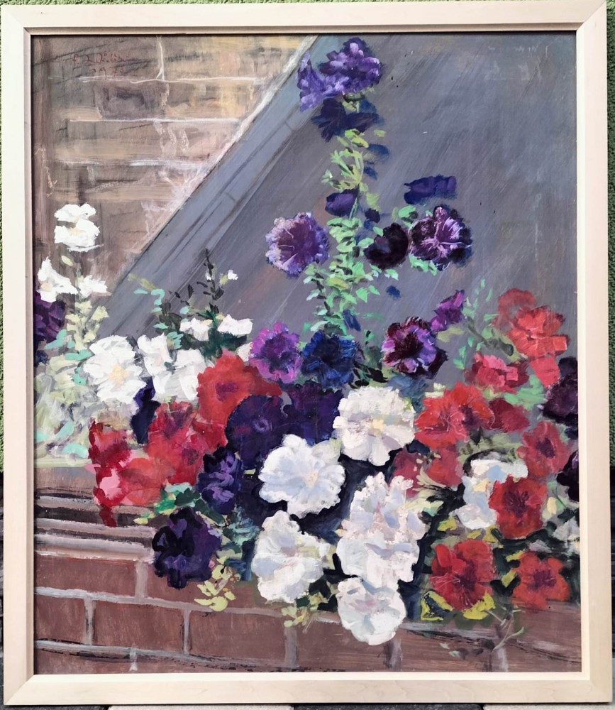 Zid cu petunii - pictură mare în ulei semnată şi datată 1973