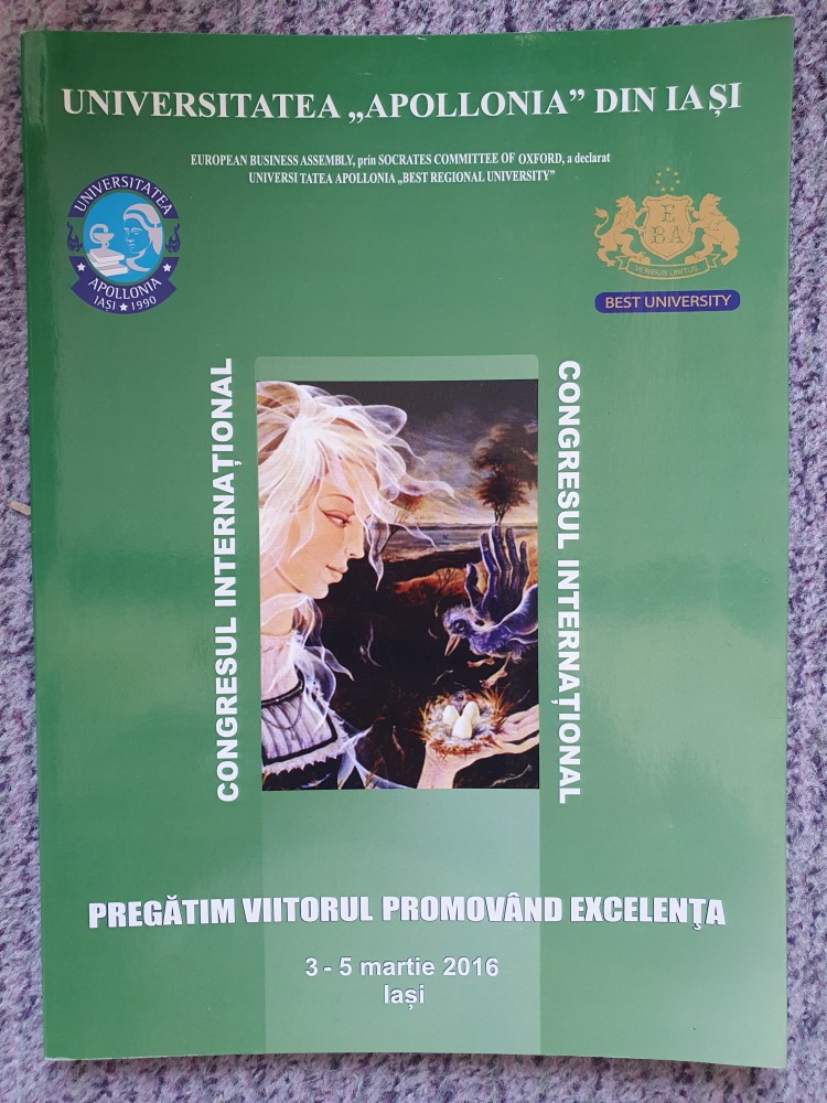 Zilele Universitatea Apollonia Iasi. Congres International. Pregatim viitorul promovand excelenta. 3-5 martie 2016, 100 pag, stare f buna.
